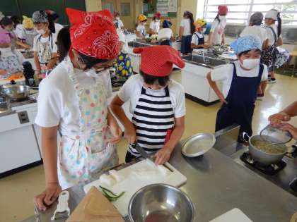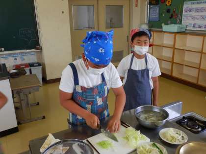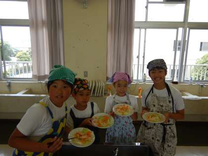Let's cook boiled vegetables!!(5年) 公開日 2018/06/08 更新日 2018/06/08 子供たちの姿 調理実習でゆで野菜サラダを作りました。班で声を掛け合い、スムーズに調理をしていました。『ねこの手』を意識して野菜を切ることもできました。 いいね(0)