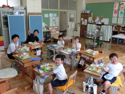 ALTの先生が、くすのき学級1組で給食を一緒に食べ、楽しいランチタイムとなりました。