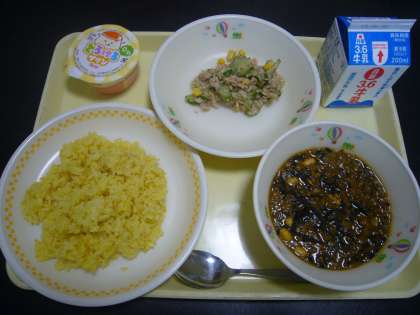 ひじきや大豆、トマト、ピーマンなど、たっぷりの食材を使いました。静岡県内の食べ物も豊富に取り入れました。子どもたちが大好きなドライカレー、抵抗なくおいしく食べることができました。