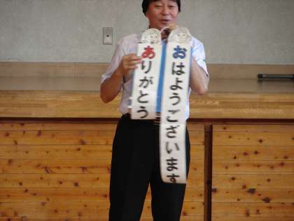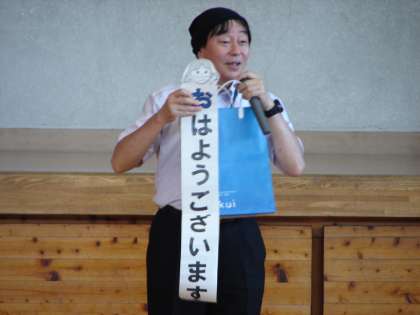 4月から取り組んでいるあいさつ「おはようございます」については、多くの人が気持ちのよいあいさつが出来るようになってきたが、これからも続けてほしい。これからはそれに加えて「ありがとう」の言葉もたくさん言えるようにしていこう、という内容でした。
