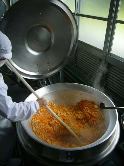 *「にんじんの金平」は、千切りにしたにんじん・油揚げ・つきこんきゃくを炒めて、だし汁と調味料を加えて、味を含ませるように水分を飛ばしました。