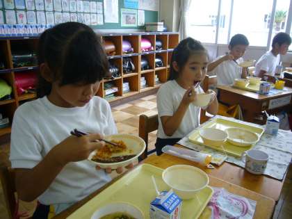 *2年生の教室では、しっかり噛んで味わっている子が大勢いました。