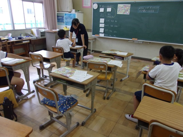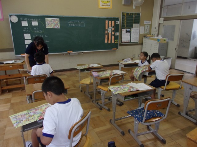 2校時の授業は算数です。6年生は「円周の求め方」を学習しています。「円周=直径×3.14」であることを理解し、応用問題に挑戦です。2年生は「何人いるかな?(かけ算)」を学習しています。「同じ数ずつのものの数え方」をみんなで考えました。