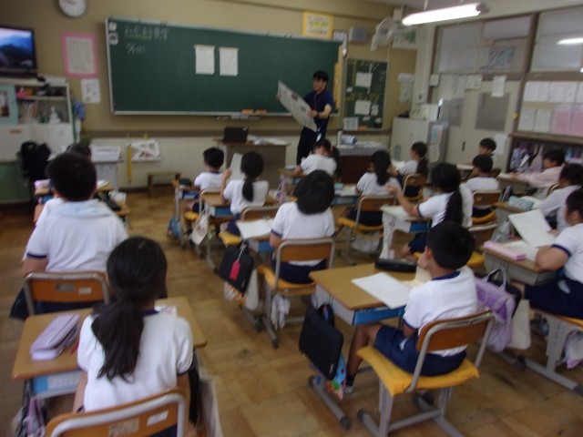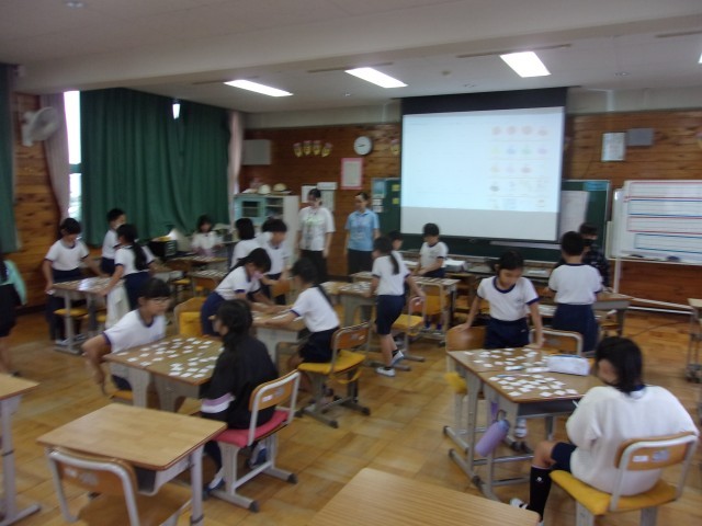 2校時の授業は、1組が外国語活動、2組が総合的な学習です。外国語活動では、オリジナルのカードを使って、トランプの「神経衰弱」ゲームを行いました。でも、単なる「神経衰弱」ではありません。自分が引いたカードの絵を見ながら、相手に英語で質問をし、相手がそれに回答するという言語活動が加わっています。じゃんけんの掛け声や相手への質問など、教室のあちこちから楽しそうな英語の声が響いていました。総合的な学習では、目前に迫った社会科見学の新聞づくりの説明を行いました。丹那牛乳工場と酪農王国オラッチェで見聞きしてきたことを記事にして、各自が新聞にまとめます。どんな作品ができあがるのか、とても楽しみです。