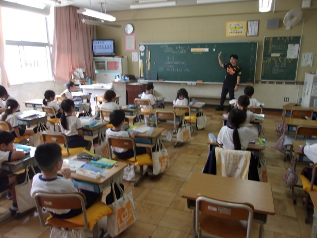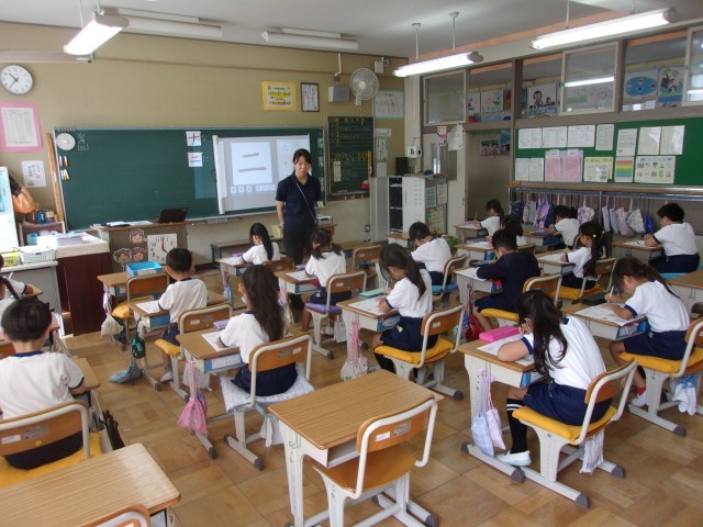 3校時の授業は、1組が算数、2組が国語です。算数では「たしざん」を学習しています。「どうすれば8+3をけいさんできるかな?」という課題を考えました。ブロックを使って3を(2と1)に分け、先に8+2=10を計算し、あとで残った1を加えて11という答えを求めていました。数の概念を学ぶのにはブロックを使って、10のまとまりを作る活動が有効です。国語では、「カタカナ」を学習しています。今日はナ行の「ナ・ニ・ヌ・ネ・ノ」の書き順の確認と、それらを含んだ単語をカタカナで書く練習をしました。