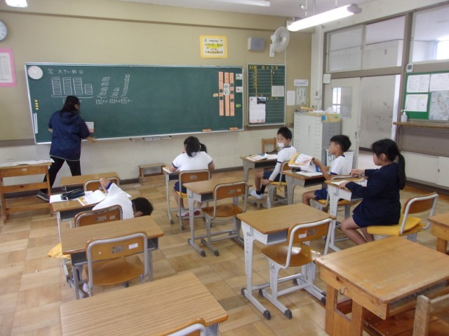 2校時の授業は、3年算数です。算数では、『数の表し方やしくみを調べよう』を学習しています。「サッカーの試合で売れた入場券は全部で何枚ありますか?」という課題に取り組んだのですが、1000より大きい数(「万」の位)が初めて登場しました。