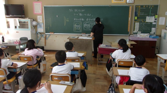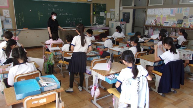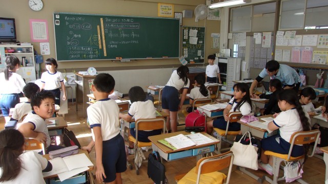 3校時の授業は、1組が図工、2組が算数です。図工では、「紙はんが」を学習しています。今回のテーマは「動いている人」です。今日の授業では、画用紙を横向きに使って、自分の顔と顔のパーツをつくりました。算数では、「大きい数」を学習しています。今日の授業では「億」という単位が登場しました。数の大小を表すしるしとして不等号を学習しました。