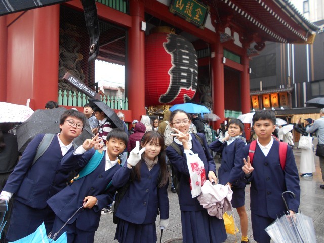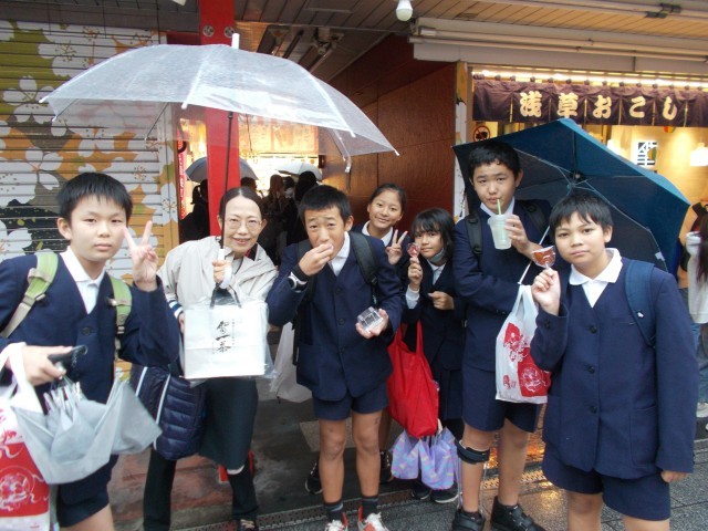 当初の計画では、上野公園内でお弁当を食べる予定でしたが、雨が降ってきましたので、クラスごとにバスの中で「おにぎり弁当」の昼食です。食事後、浅草寺に向かいました。傘をさしながらの移動でしたが、みんな元気いっぱいでした。