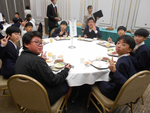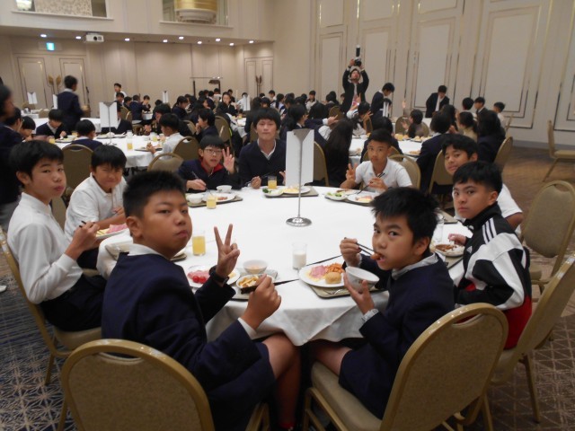 旅行2日目の朝を迎えました。朝食会場(ホテル4階:「飛翔の間」)に移動して、バイキング形式の朝食です。今日も1日元気に過ごすため、お腹いっぱいにエネルギーチャージです。