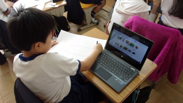 タブレットで描きたいものを見つけて画用紙に表し、はさみで切ってのりで繋いで「版」をつくりました。