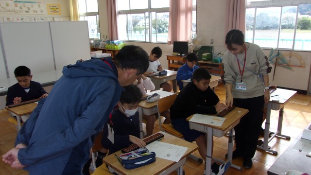 2校時の授業は、4年算数です。「そろばんを使った計算の仕方(たし算・ひき算)」を学習しています。今日は、3年生で学習した「五玉・一玉・定位点」などの用語を確認し、そろばんの置き方を復習しました。その後、繰り上がりのあるたし算を、そろばんを使って計算しました。