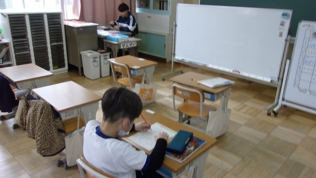 1校時の授業は、いずみ1が3・4年算数と6年図工、いずみ2が3年算数、いずみ3が6年社会・5年自立・4年算数です。6年図工ではステンドグラスを制作していました。現在、いずみ学級では、清水町芸術祭に向けて出品の準備を進めています。どんな共同作品ができあがるか楽しみです。6年社会では「室町時代の文化」を学習しました。その他の学年も、プリントやタブレットを使って、熱心に学習に取り組んでいました。