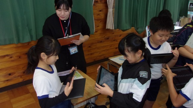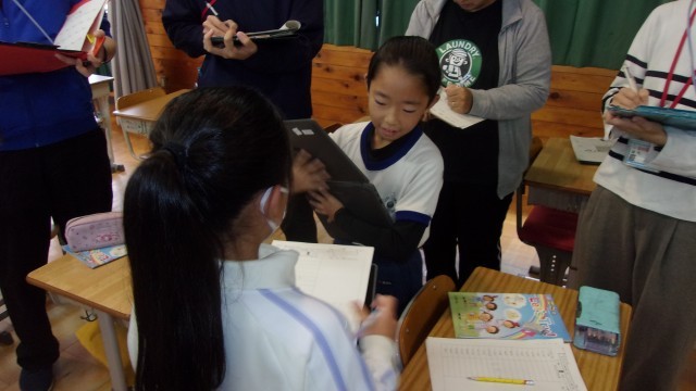 2校時には1組の中心授業(外国語活動)、3校時には2組のチャレンジ授業(外国語活動)が行われました。本日は校内研修の日ということで、職員が大勢参観に訪れました。多くの職員に囲まれ、子どもたちは緊張している様子でしたが、授業が進むにつれて緊張もほぐれ、いつもの明るい雰囲気の中、授業が進行しました。友達の好きなものを詳しく聞き取る活動では、子どもたちはコミュニケーションキーワード(スマイル・アイコンタクト・クリアボイス・リアクション)を意識しながら、友達との会話を楽しんでいました。