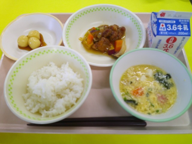 秋の野菜をたっぷり入れた「鶏肉と秋野菜の揚げ煮」はさつまいもの黄色と、にんじんのオレンジ色、れんこんの白色、枝豆の緑色が秋らしい鮮やかな彩りに仕上がりました。「今日の給食で、これが1番美味しかったです!」という声がたくさん聞かれました。