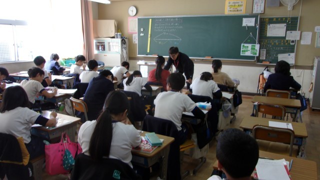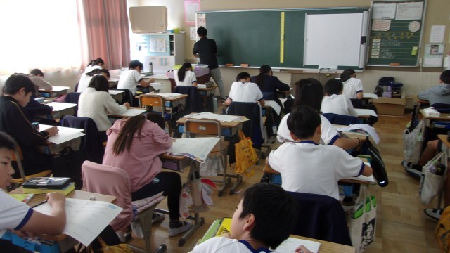 2校時の授業は、1組が社会、2・3組は算数です。社会では「江戸幕府と政治の安定」「町人の文化と新しい学問」のテストを行いました。学習内容を思い出しながら集中して取り組んでいる様子が見られました。算数では「比とその利用」を学習しています。2組では比を使った文章問題に挑戦していました。「長さ72㎝のリボンを姉と妹で長さの比が5:4になるように分けます。それぞれ何㎝になりますか?」という問題です。子どもたちは、それぞれがノートに自分なりの解答を書いていました。3組では、明日のテストに備えて、練習問題のプリント「比とその利用」に取り組みました。