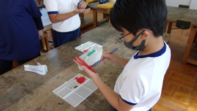 使う絵の具の色選びでは譲り合う姿が見られ、どの子も授業者の話をしっかりと聞いて手順を確かめながら作品を仕上げていきました。