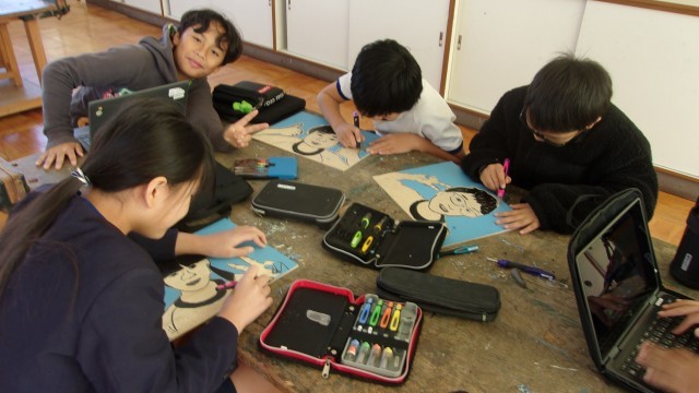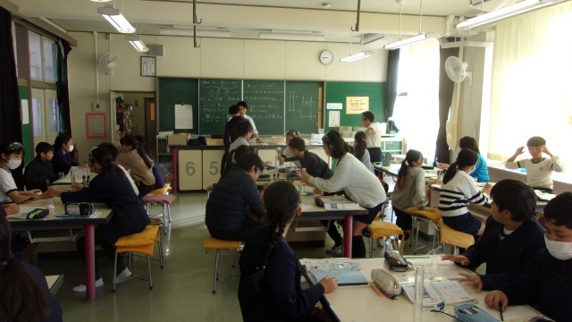 1校時の授業は、1組が図工、2組が理科です。図工では、「ほり進めて ほり重ねて(カラー版画)」を学習しています。木の板に自分の顔を描き、彫刻刀で彫って、色を付けて印刷します。丁寧に作業を進めていましたので、どんな作品ができるのか、とても楽しみです。理科では、水溶液の実験を行いました。水に食塩を溶かすと、見た目には普通の水と区別がつかなくなってしまいます。子どもたちは「見えなくなった食塩はどうなったのか?」「重さはどうなるのか?」などの課題に対して、それぞれが結果を予想して、実験に取り組みました。