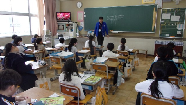 1校時の授業は、どちらのクラスも算数です。3年生は、今、小数の学習を進めています。今日は、プリントを使って、「大小の比較」や「小数のたし算・ひき算」を復習しました。今までは「2.5+1.3」や「5.7-4.1」のような計算でしたが、今日は「10-3.7」のような形の出題があり、悩んでいる子も見られました。