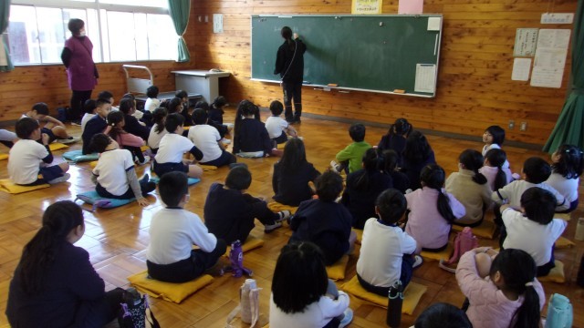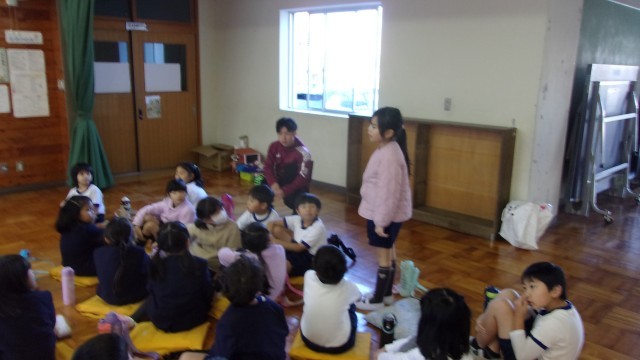 1校時の授業は、2クラス合同の生活です。きつつきホールに2クラスが集合し、「自分たちのお店を出そう」という企画について話し合いました。明日、開催される「ふれあいパーク」で、1年生はお客さんとして上級生が開くお店を見に行きます。それをお手本にして、自分たちもお店を出し、来てくれるお客さんをもてなそうというわけです。楽しい時間が過ごせると良いですね。