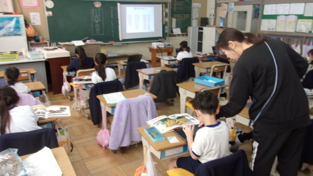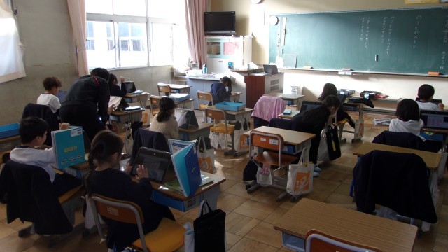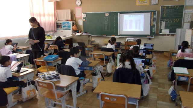 1校時の授業は、どちらのクラスも国語です。国語では「乗り物カードをつくろう」を学習しています。乗り物図鑑などの本を参考に、タブレットを使って、乗り物カードのメモ(乗り物にはどんな役目とつくりがあるのか)を作成しました。