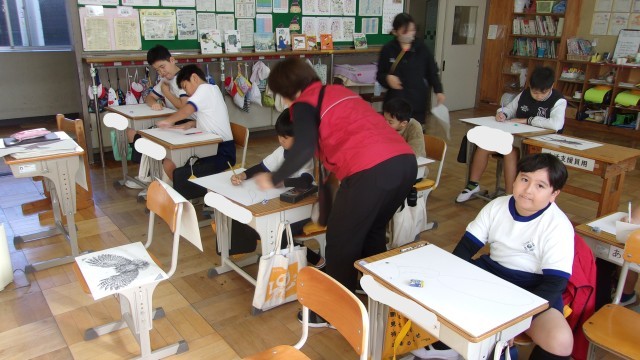 図工では「空を飛ぶ生き物」をテーマに描きたい動物を決め、夢中になって取り組んでいました。