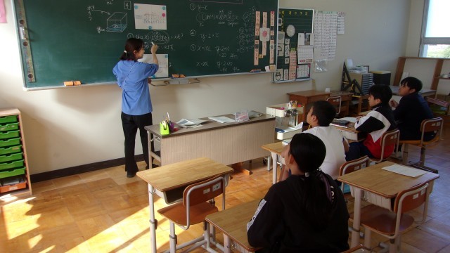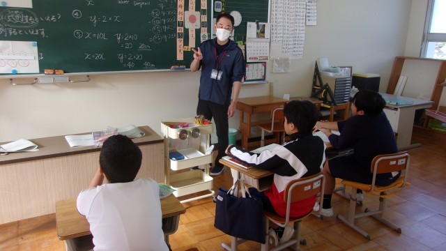 学習のまとめで授業者が「xが2倍、3倍・・・となる時に、yも2倍、3倍・・・となる」と確認し、その上で外国語支援員からも母語で説明をしてもらいました。