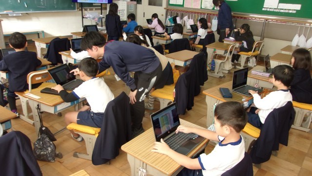 タブレットに自分の発表の声を吹き込み、聞き返すことで、声の大きさや速さを客観的に振り返っていました。