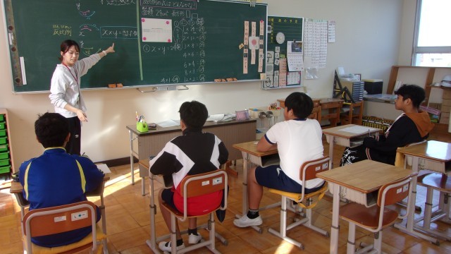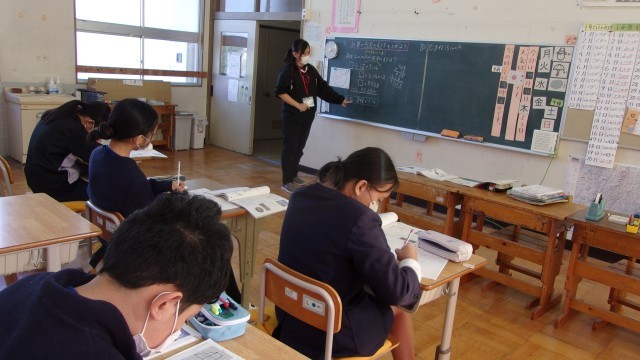 2校時の授業は算数です。6年生は反比例の式を学習しています。比例が「y=(決まった数)×x」だったのに対して、反比例の場合は「x×y=(決まった数)」になるということを説明を聞きながら理解しました。5年生は「計算で円周の長さを求めよう」という課題に取り組みました。「円周の長さ=直径×円周率(3.14)」の公式に当てはめて計算する様子が見られました。