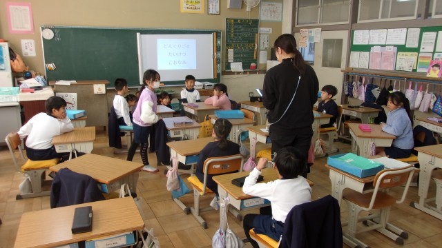 2校時の授業は、どちらのクラスも生活科です。12/18(木)に計画している西幼稚園児との交流会に向けて準備を進めています。「ゆめのわくわくどきどきパーク」と名付けた遊び場を用意する予定ですが、内容はまだ秘密です。当日の「お楽しみ」にしてください。児童は、園児を招待するために役割分担を決め、練習に励んでいました。