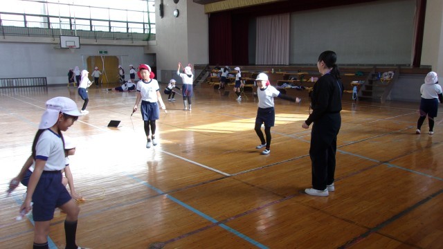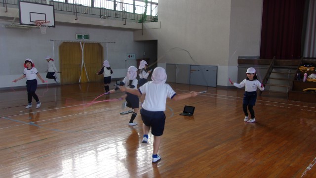 2校時の授業は、体育館で2クラス合同体育です。縄跳びでいろいろな技に挑戦していました。最終的には、曲に合わせて「縄跳びを使ったリズム運動」に仕上げるとのことでした。そろった動きや個々に披露する技のバリエーションなど、どんなリズム運動が完成するのか楽しみです。