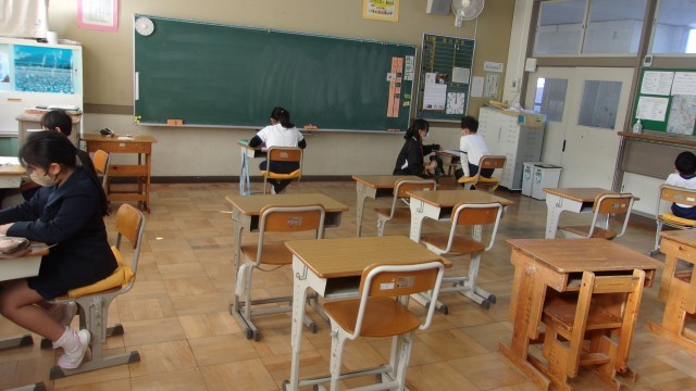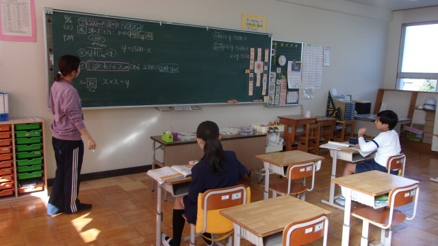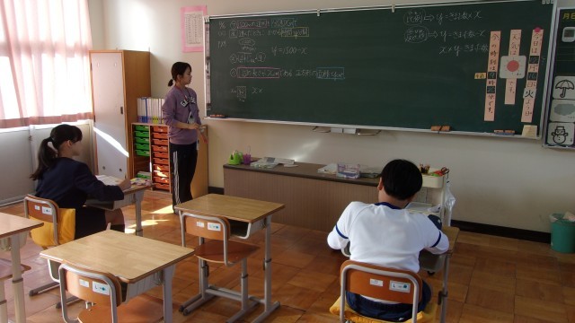 2校時の授業は算数です。6年生は、教科書の「考え方モンスターでふりかえろう」のページの問題に挑戦しました。5つの選択肢の中から比例・反比例の関係にあるものを1つずつ選ぶ問題です。問題文にそって式をつくり、どんな関係にあるのかを考えて、判断をしました。3年生は「三角形と角」のテストを行いました。質問の意味がよく分からない子が手を挙げると、担当の先生が解説をし、意味を理解してから問題を解くようにしていました。