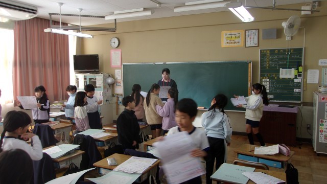 2校時の授業は、1組が算数、2組が国語です。どちらのクラスもテスト返しと見直しを行っていました、1組では「三角形と角」のテストが配られ、点数を見て喜んだり、残念がったりする様子が見られました。間違えたところはきちんと復習しておきたいですね。2組では、「モチモチの木」「せっちゃくざいの今と昔」「道具のひみつをつたえよう」など複数のテストが配られ、見直しの活動に大忙しでした。点数だけにとらわれず、見直しをしっかりしてほしいと思います。