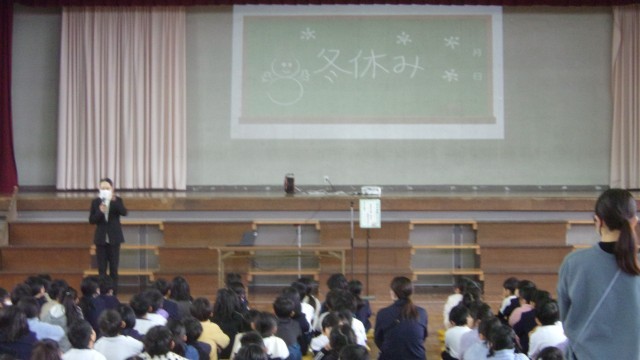 今日で「やりきるステージ」が終わり、いよいよ明日から冬休みに入ります。今朝は、体育館に全校が集まり、校長先生と生徒指導主任のお話を聞きました。校長先生は、主に「やりきるステージ」の振り返りについて話し、生徒指導主任は冬休み中の生活について「にっしーくんとの約束」を確認しました。集会の後、「税の標語コンクール」と「駿東文園作文コンクール」の受賞者を表彰しました。明日からは、11日間の冬休みに入ります。事故や事件に巻き込まれないよう十分に注意し、有意義な冬休みを過ごしてほしいと思います。2025年も学校の教育活動に御協力くださり、本当にありがとうございました。どうぞ良いお年をお迎えください。