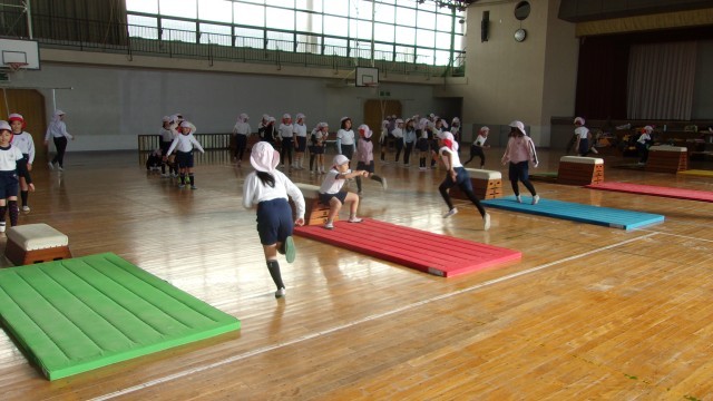 2校時の授業は、体育館で2クラス合同体育です。種目は跳び箱です。何段の跳び箱で練習をするか、自分で選択できるよう5つのレーンに分けて、各自が自分で決めて練習に取り組んでいました。跳べて自信がついたら1段アップという具合にやっていけば、さらに上の段を跳べるようになると思います。自己ベストを目指して頑張ってほしいです。