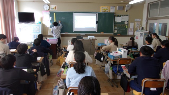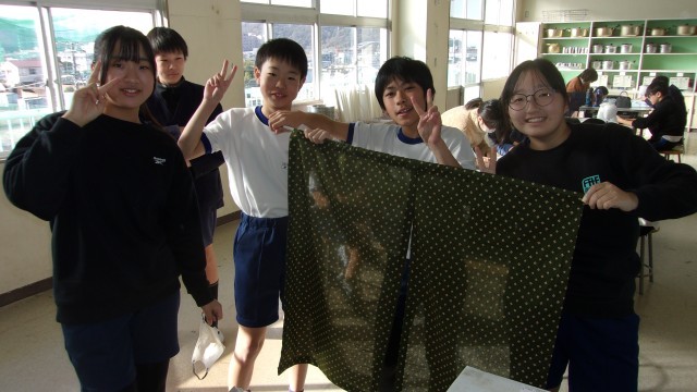 2校時の授業は、1・3組が算数、2組が家庭科です。算数では「6年間の算数の復習をしよう」というプリントで、さまざまな問題に取り組んでいます。1組では個人で考えたり、ペアで教え合ったりする姿が見られました。3組では、「整数の性質をまとめよう」の問題のところで、担任の先生が12の約数を例に説明をしていました。家庭科では、トイレの出入り口に付ける暖簾(のれん)を作っています。毎年、6年生が在校生のために卒業制作として考えて作ってくれるのです。今日はその第1号が完成したということで、笑顔でお披露目してくれました。