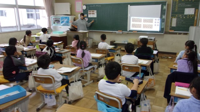 2校時の授業は、どちらのクラスも算数です。「大きなかずをかぞえよう」を学習しています。1組では「どうすればたくさんのものを数えられるかな?」という学習課題に対して、「10のまとまりを作って、それを数えればよい」という意見をあげていました。2組では、10のまとまりを「十の位」、残りのばらを「一の位」という言葉で表現することを教わりました。