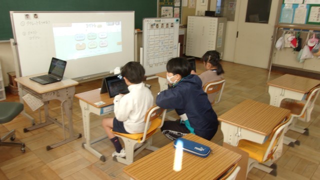 2校時の授業は、いずみ1が算数、いずみ2が自立、いずみ3が国語です。算数では、学年別に3グループに分かれ、「たし算」「時計の見方」「整数・小数・分数」の問題を解いていました。自立では、1年生がタブレットでコグトレに挑戦し、2年生はタブレットを使って、自分が作りたいおもちゃと必要な材料をまとめていました。国語では、4年生が「数え方を生み出そう」という文章を読み、独自の数え方を発案して、それを宣伝する活動を行いました。6年生は「宇宙への思い」という文章を読み、そこに描かれた3人がどんなことをしているのか、タブレットを使ってまとめました。