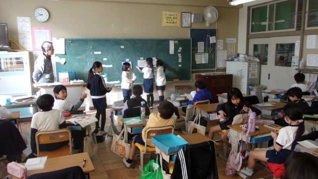 2校時の授業は、1組が国語、2組が生活です。国語では、「あなのやくわり」という説明文を読み、身の回りにはどんな穴があるのかを考えました。本文を「はじめ・中・終わり」の3つに分け、筆者が問いかけている文を探しました。生活では、「明日へつなごう 自分たんけん」を学習しています。小さい頃のエピソードを一人ずつ前に出て発表していました。