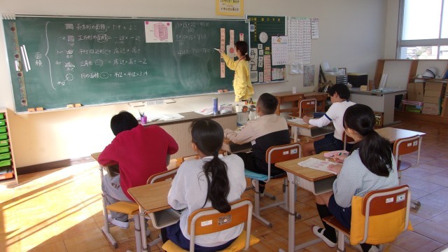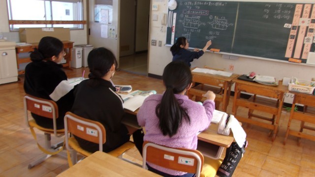 2校時の授業は、2年国語と5・6年算数です。国語は大小のカードを使ってゲームを行っていました。5年の算数では「お米の量の関係は?」を学習しました。低学年のお米(72グラム)と高学年のお米(90グラム)を比較し、「○倍とあらわすことができるか」を考えました。6年算数では三角柱や直方体の体積を求める問題を解いていました。