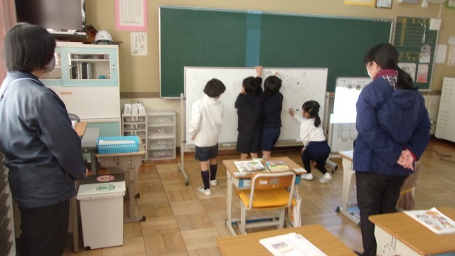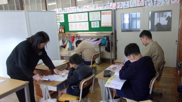 2校時の授業は、いずみ1が国語、いずみ2が1・2年音楽、いずみ3が国語(図書館)です。いずみ1では、低学年が「絵を見て文をつくる」活動をしました。高学年は漢字ドリルに取り組みました。いずみ2では、わらべうた『さんちゃんが』を聞きながら、ホワイトボードにたぬきの絵を描いていました。みんな楽しそうに笑いながら活動していました。いずみ3は、図書館で好きな本を借りました。週に1回、こうやって図書館を利用し、興味のある本を読むのは良いことですね。
