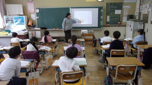 1校時の授業は、どちらのクラスも国語です。「子どもをまもるどうぶつたち」を学習しています。1組では、オオアリクイとコチドリの知恵について動物カードにまとめる活動をしました。2組では、オオアリクイの親が子どもを背中に乗せている動画(一体化して見える様子)を確認した後、コチドリについて親の知恵を読み取りました。他の動物(ライオン)との違いを意識しながら、本文を読んでいる様子が見られました。