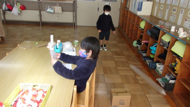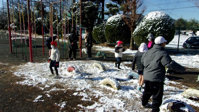 昨日降った雪が残っていたため、1組は運動場に出て雪玉を作ったり、雪を投げたりしながら、その感触を楽しみました。