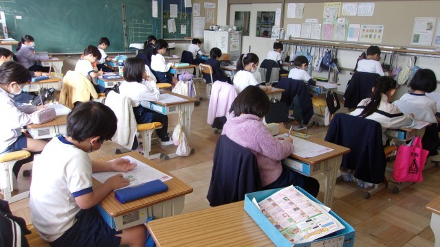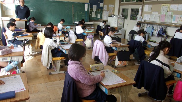 1校時の授業は、どちらのクラスも国語です。1組では「たからものをしょうかいしよう」を学習しています。自分が大事にしている宝物をみんなに紹介し、その理由も説明していました。2組では、「くらべてつたえよう~反対の意味の言葉~」のテストを行いました。静かな雰囲気の中、テストに集中して取り組んでいました。