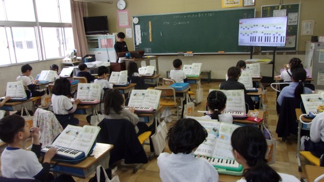 2校時の授業は、どちらのクラスも音楽です。「こいぬのマーチ」を学習しています。今回の学習課題は「互いの楽器の音を聞き合いながら演奏しよう」です。この曲を今日初めて聞いたという子もいたようです。1組では、けんばんハーモニカで演奏し、2組では楽譜を見ながら歌っていました。