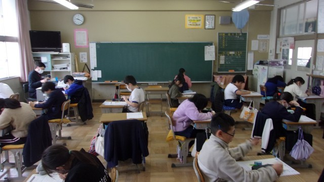 2校時の授業は、どちらのクラスも算数です。1組では「立体の展開図」を学習しています。立体を展開図で表し、「点Mと重なるのはどの点?」「辺EFと重なるのはどの辺?」などの課題に取り組みました。2組では、「分数」のテストを行いました。帯分数や仮分数に直す問題、分数の計算、分数を使った文章問題などさまざまな出題がありました。子どもたちは集中して問題を解いていました。