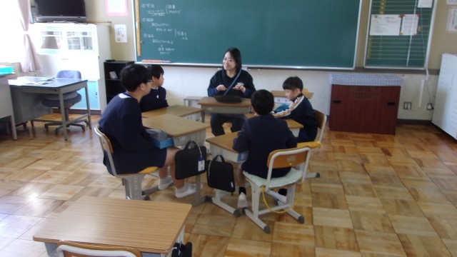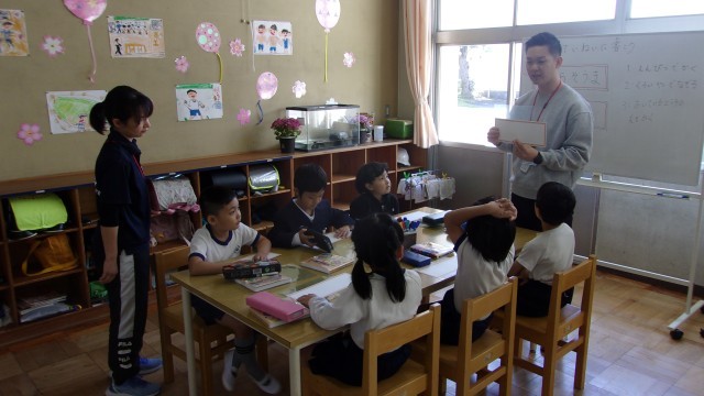 2校時の授業は、全てのクラスが国語です。いずみ1では自己紹介カードを書きました。2つのグループに分かれ、担任の先生と支援員さんから説明を受けて熱心に取り組んでいました。いずみ2では、「自分の名前をていねいに書こう」という活動に取り組みました。カードに鉛筆で名前を下書きをし、黒ペンで清書しました。空いているスペースに絵を描きました。いずみ3では、お互いの顔が見えるような座席配置にし、自己紹介をしました。自分が好きなことなどを発表し合いました。