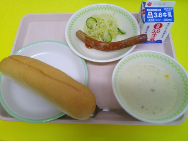 今日は、背割りロールパンにウインナーを挟んで、自分でホットドッグを作ることができる給食でした。
