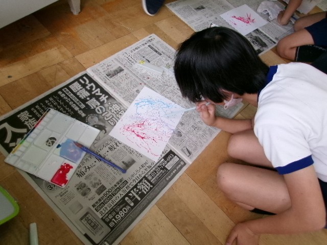 ぽとりと画用紙の上に垂らした絵の具をストローを使って広げたり、筆を持った腕を揺らして飛び散った模様を楽しんだりしていました。