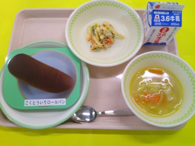 今日は、学校で人気のある黒糖いりロールパンの給食でした。