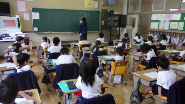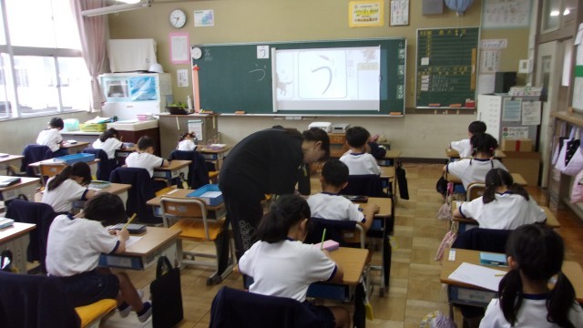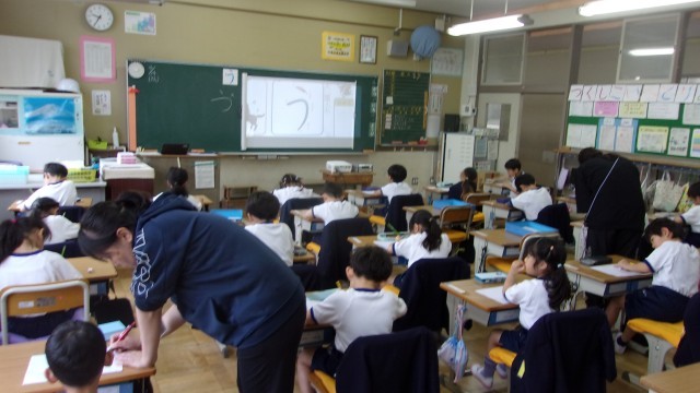 2校時の授業は、どちらのクラスも国語です。ひらがなの学習をしています。1組は「え」を練習しました。「えはがき」「えにっき」「えをかく」などのときに「え」を使うことを確認し、プリントで「えき」「えび」「えのぐ」「えんぴつ」などの単語をなぞり書きしました。2組は「う」の練習です。「うま」「うきうき」「うたいだす」などのときに「う」を使うことを確認し、プリントで「うし」「うみ」「うさぎ」「うぐいす」などの単語をなぞり書きしました。